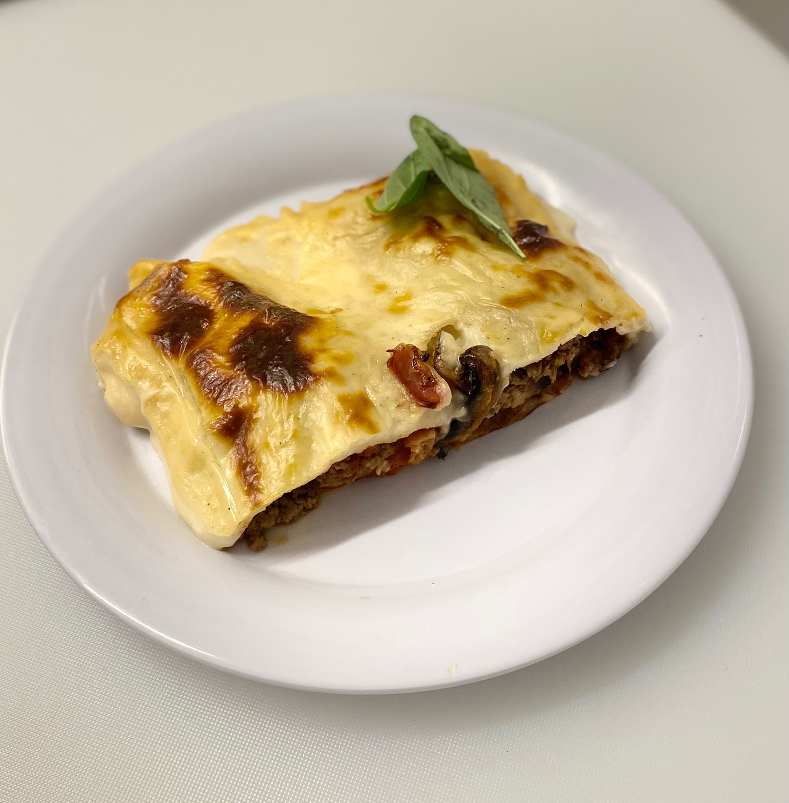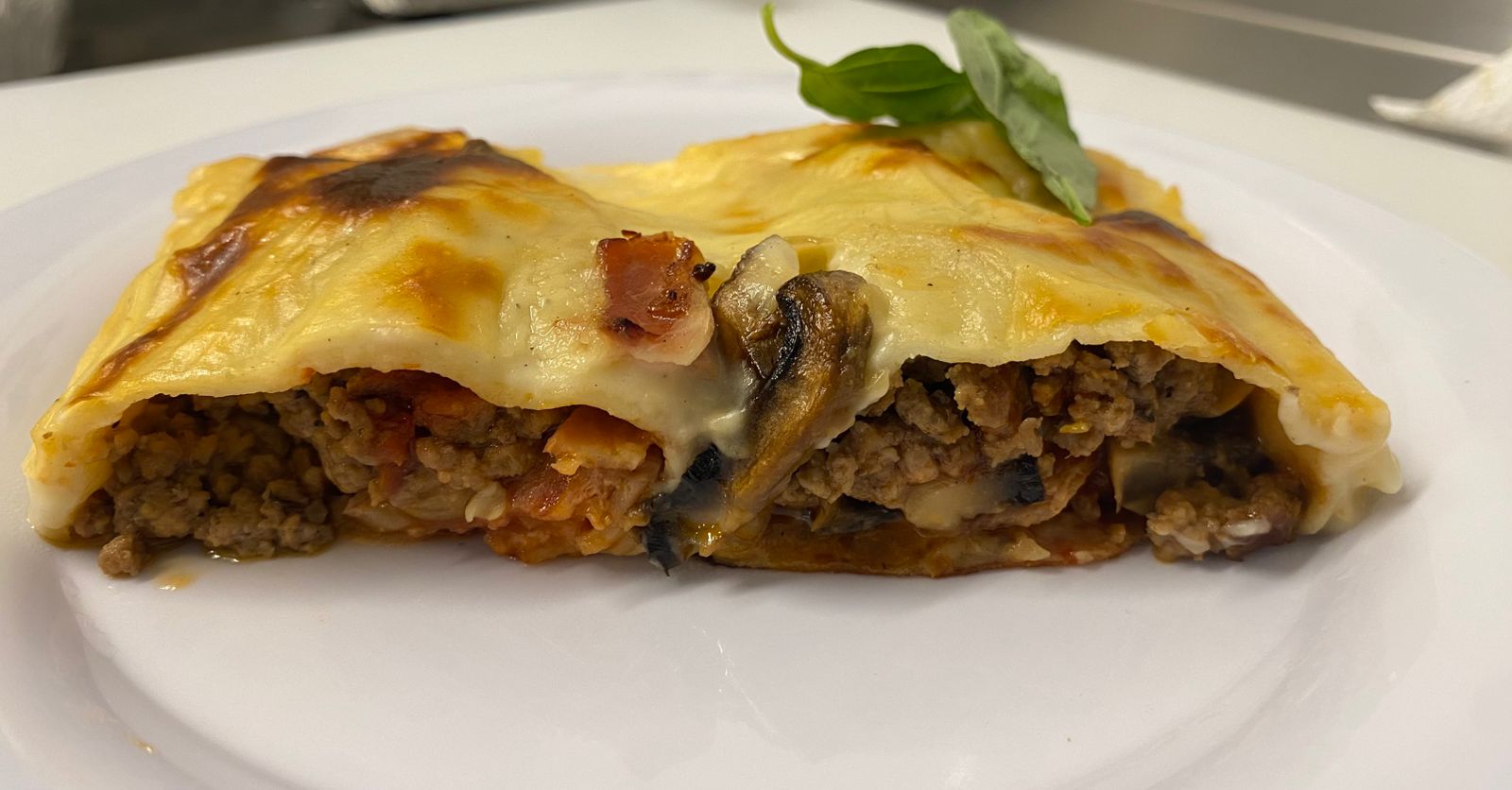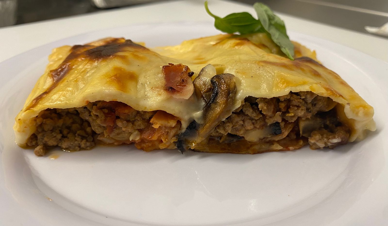 Ingredientes: Carne molida, tocino, champiñones, salsa de tomate y salsa bechamel.