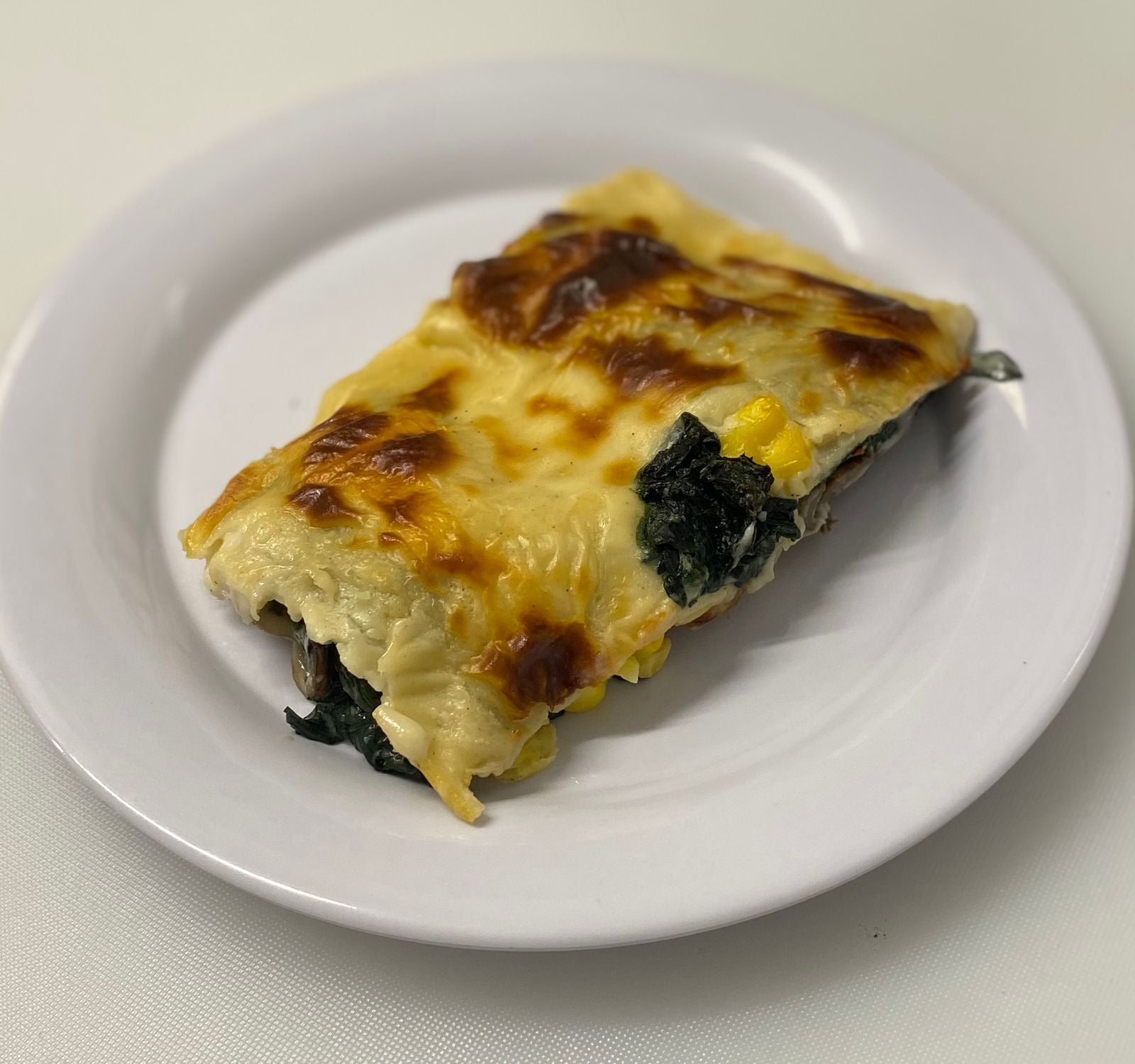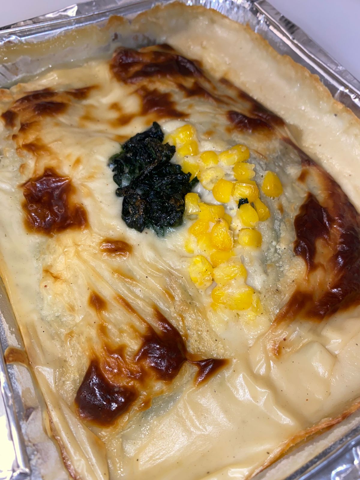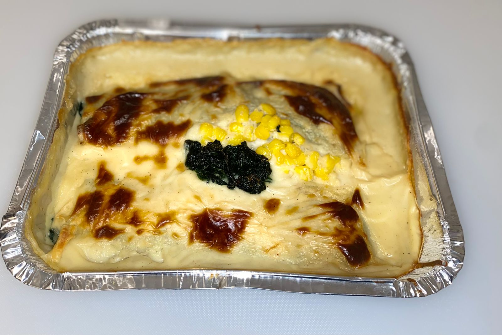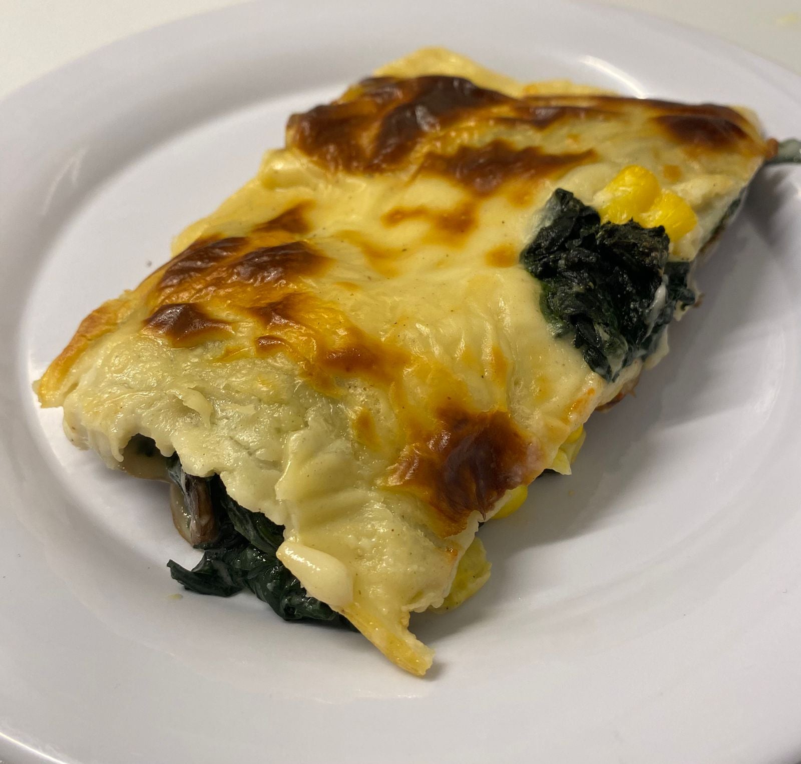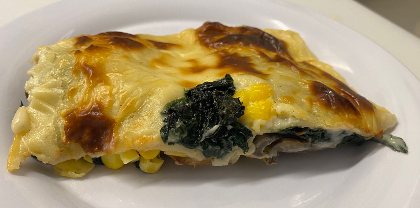 Ingredientes: Espinacas a la crema, champiñones, choclo, huevo y salsa bechamel.