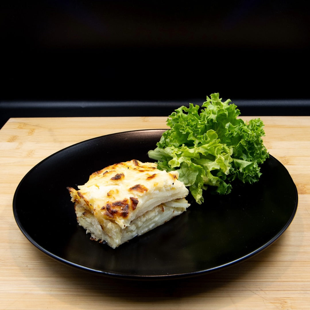 Ingredientes: Papas laminadas, queso parmesano, crema y mantequilla.