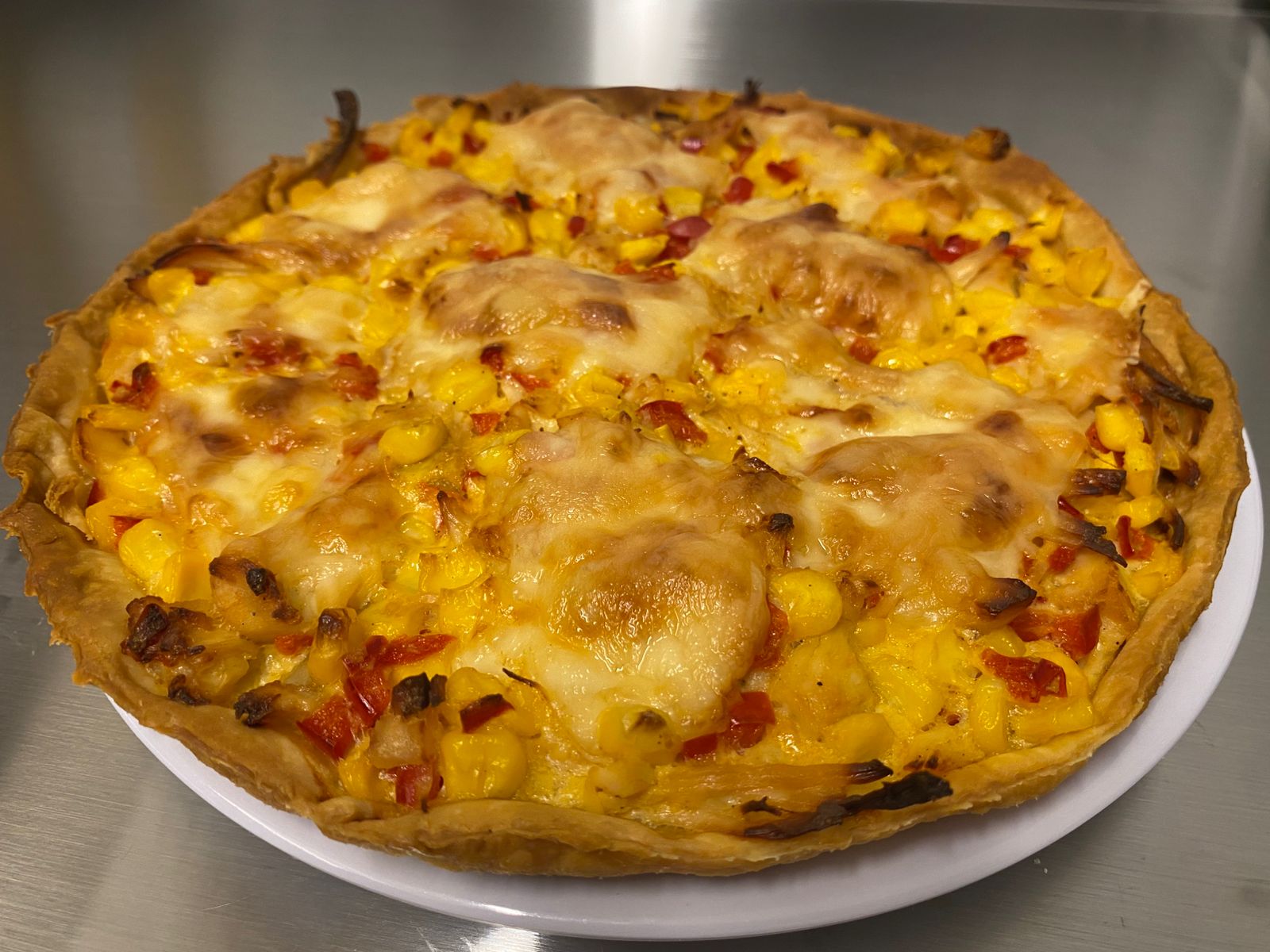 El clásico sabor del pollo y choclo chileno, llevado al formato elegante y reconfortante del quiche. El pollo desmenuzado se combina con granos de choclo dulce, cebolla salteada y un fondo de crema especiada, todo sobre una base de masa dorada al horno. El queso fundido y el gratinado superficial coronan esta versión sabrosa, contundente y familiar.